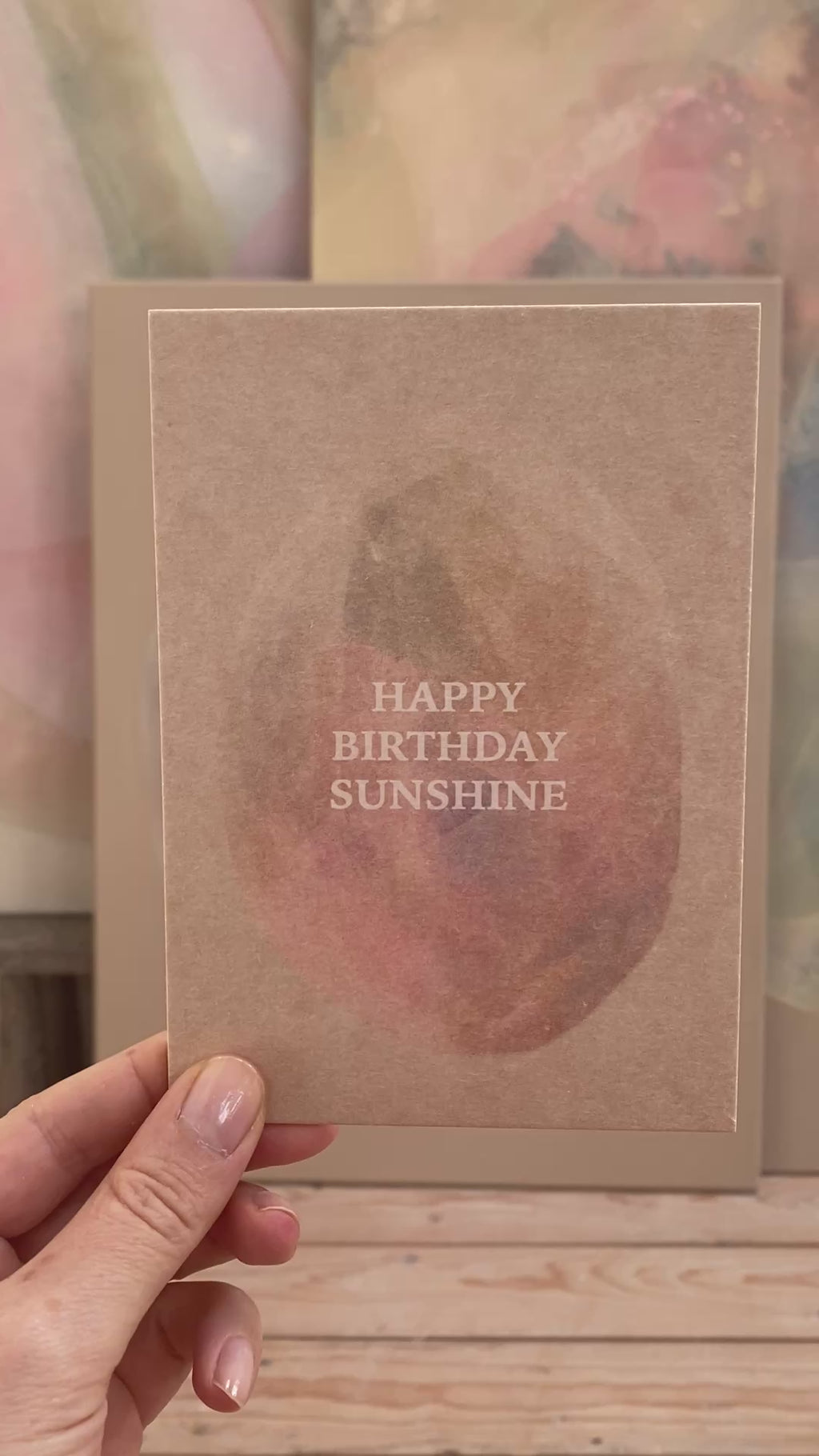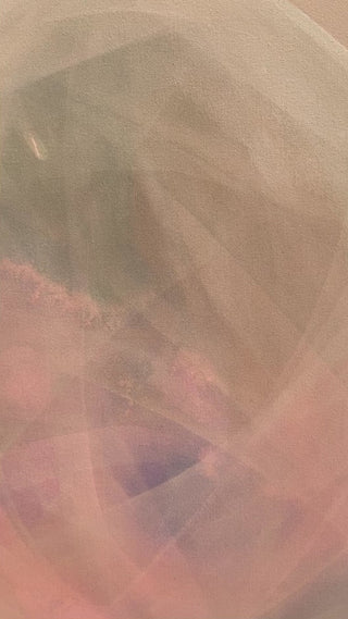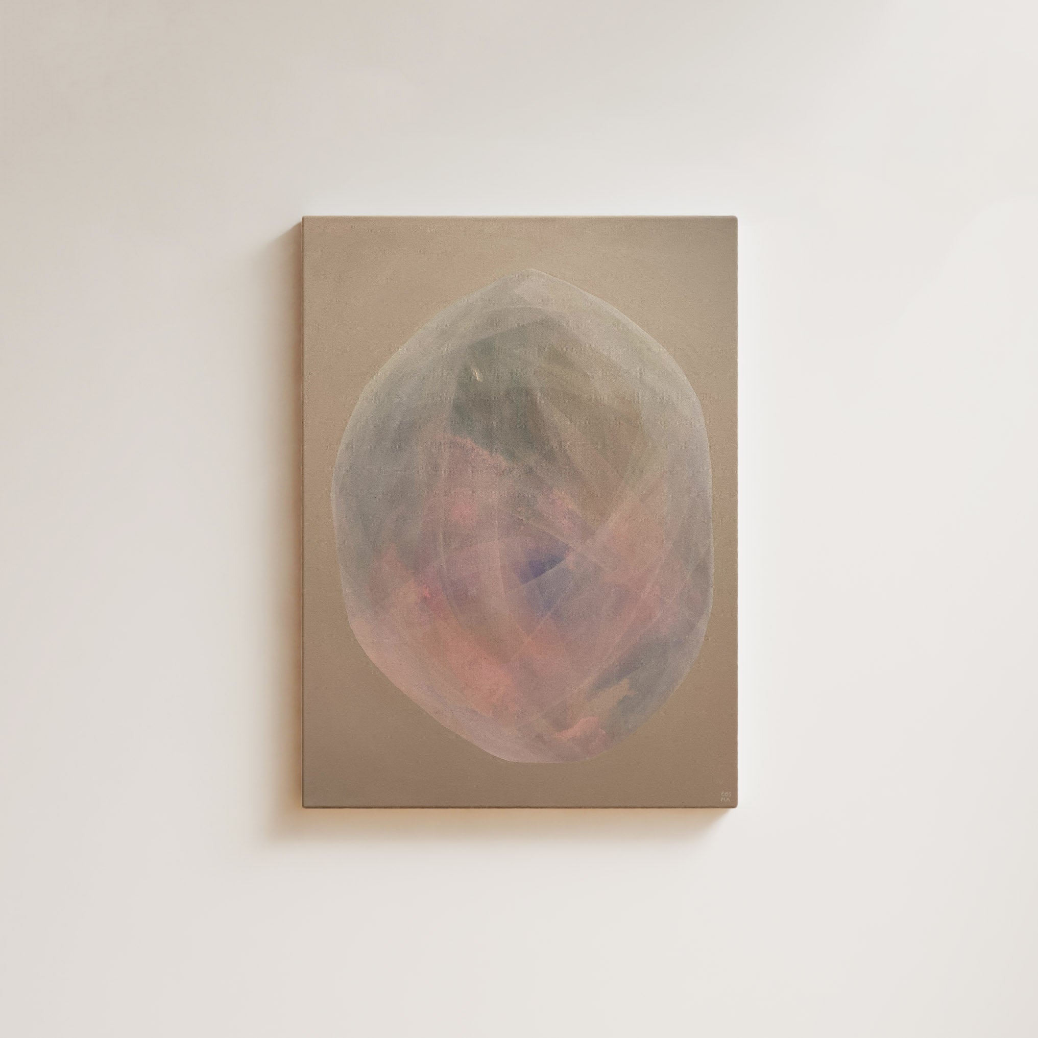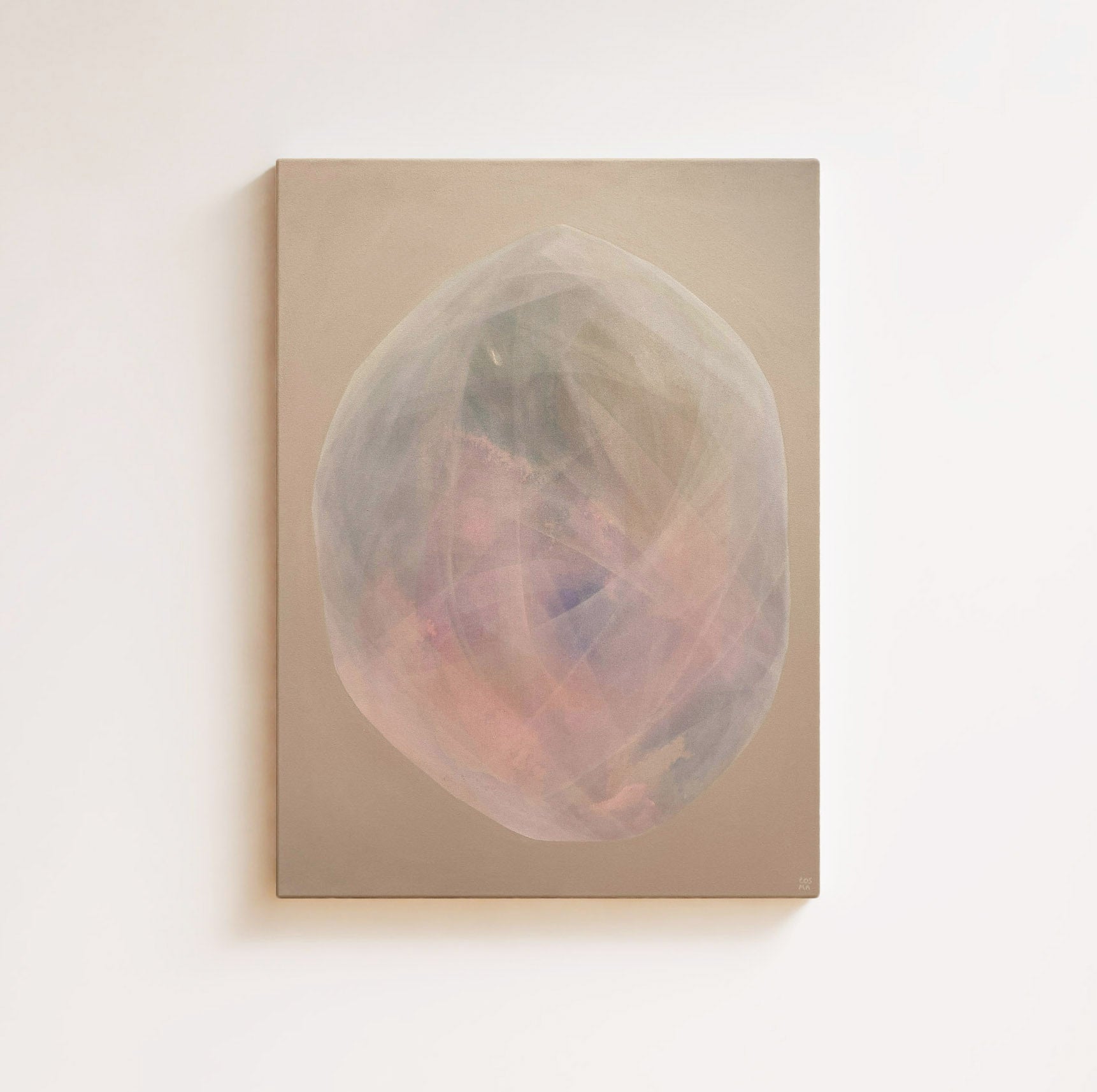 Subtile Nuancen aus Rosé, Grün, Blau und lichtem Weiß entfalten sich auf einem ruhigen Beigeton im Hintergrund und schaffen eine Atmosphäre von Ruhe und Klarheit, die jeden Raum sanft erfüllt.